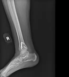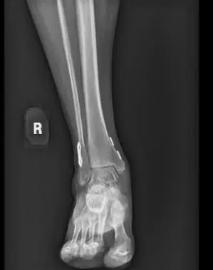 At his four-month follow-up, the patient was fully weight-bearing and had returned to work at full duty. He no longer required a brace and had full ankle stability with minimal pain. Follow-up X-rays showed complete healing with no hardware complications.