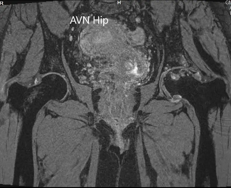 An MRI was obtained which showed altered signal intensity in both T1WI and T2WI. There was a subtle collapse of the left femoral head. A serpiginous hyperintense line was seen on T2WI demarcating an area of osteonecrosis in the left femoral head. This area involved the lateral and medial compartment and covered more than 50% of the surface area of the head.