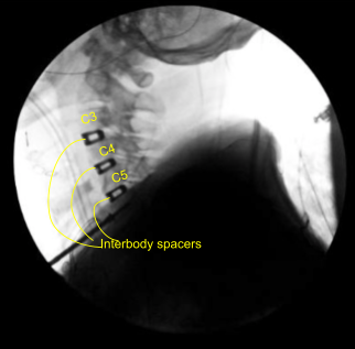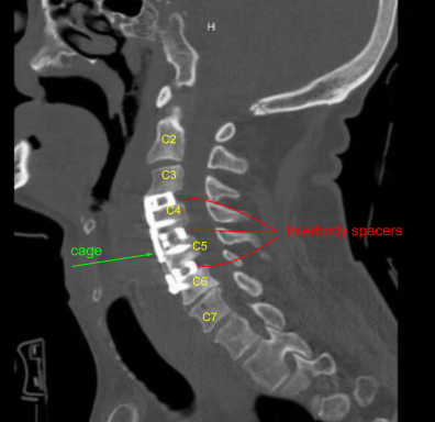 Case Study: Anterior discectomy and fusion C3-4, C4-5 and C5-6 and Insertion of interbody titanium cage globus; C3-4, C4-5 and C5-6