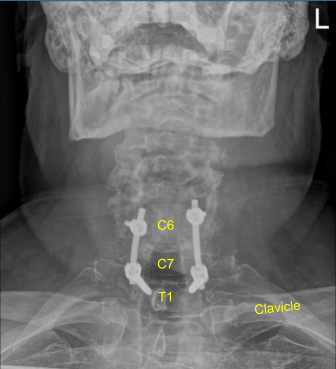 Image-guided stereotactic frame with neuronavigation techniques were used to place the instrumentation. We placed bilateral T1 pedicle screws and decorticated with electric high-speed drill cannulating with the navigated pedicle finder, palpating for breaches, measuring the depths, under tapping by 11 mm and placing 30 mm x 5.0 mm titanium pedicle screws bilaterally without difficulty.