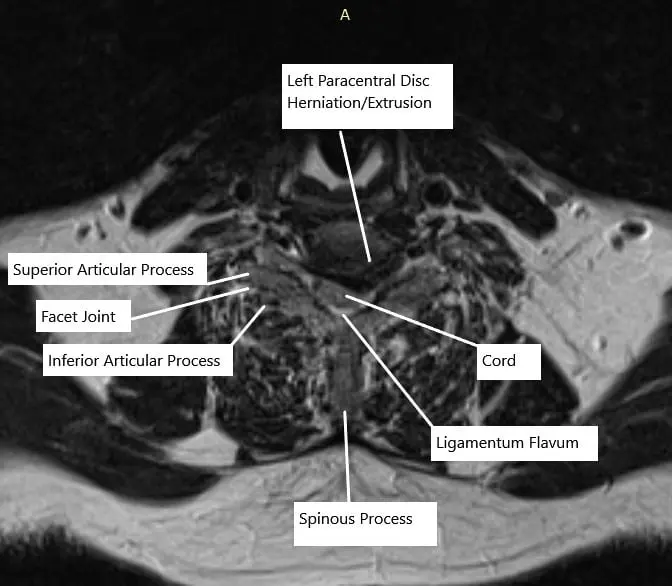 The physical examination corroborated the MRI findings of the cervical spine which suggested at C5-C6, there is a posterior disc osteophyte complex. There is severe spinal canal stenosis and there is bilateral uncovertebral joint hypertrophy. There is moderate to severe right and severe left neural foraminal stenosis.