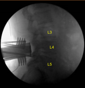 Spinal needle and fluoroscopy were used to localize the L5-S1 level. A midline incision was demarcated. Skin was sterilized with DuraPrep. Sterile drapes were placed in usual manner. 1% lidocaine with epinephrine was infused.