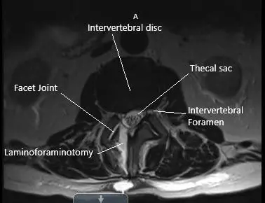 Post-operative axial MRI section showing laminoforaminotomy at L2-L3.