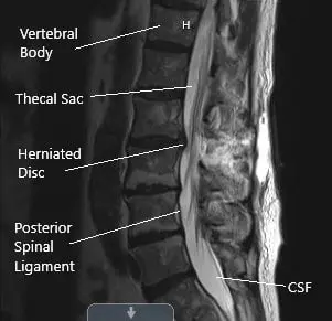 Preoperative Axial MRI section at the L2-L3 level showing herniated disc.
