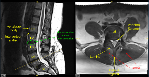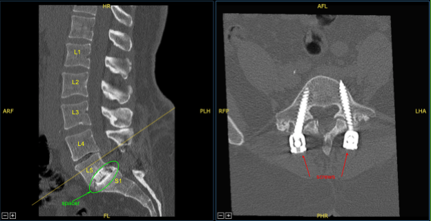 Next, a new CT scan was obtained, which showed correct positioning of the new pedicle screws and interbody spacer. Bilateral transverse processes of L4, L5, and lateral ala were decorticated for arthrodesis. Pre-cut, pre-contoured rods reflected and placed across the tulips from L4 to S1 and secured with locking caps and finally tightened with the torque and anti-torque device.
