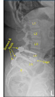 Morselized autograft and allograft were placed into lateral gutters from L4 to S1 for the arthrodesis. Wound was irrigated copiously throughout the procedure. Vancomycin powder was applied. Closure was performed by a plastic surgeon.
