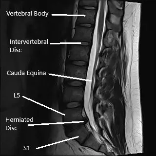 MRI image of the lumbar spine in the sagittal section showing herniated disc.