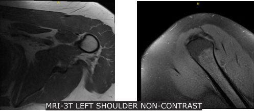 Xray were reviewed and discussed that his left shoulder showed normal radiographs. Advised patient to take MRI for us to see the reason behind and found out partial thickness tear of the subscapularis tendon though there is no high-grade partial or full thickness rotator cuff tear. Presence of supraspinatus and infraspinatus tendinosis.