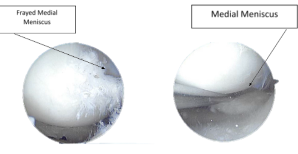 A probe was introduced. The medial meniscus tear was seen going through the body and the posterior horn up to the root. Shaver was introduced and the margins were cleaned. Upbiter and straight biter were used to remove the degenerated meniscus along the inside edge of the medial meniscus. The scope was moved to the intercondylar notch where an ACL was found to be intact with degeneration.