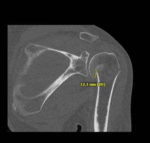 CT scan result also discussed to patient, comminuted proximal humeral fracture is impacted and slightly angulated fracture component at the surgical neck, slightly displaced fracture fragment at the greater tuberosity and a subtle nondisplaced fracture at the lesser tuberosity.