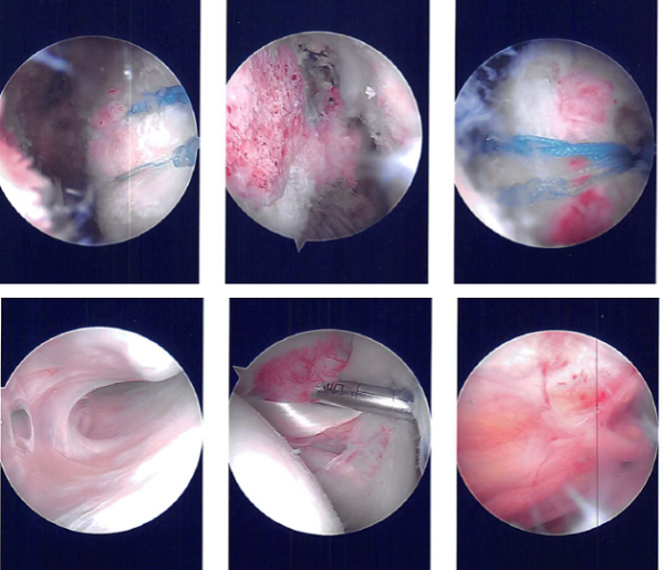 There was acromial spurring which was cleaned using a bur and sub acromioplasty was performed. After a thorough sub acromioplasty and release of CA ligament, the rotator cuff was inspected.