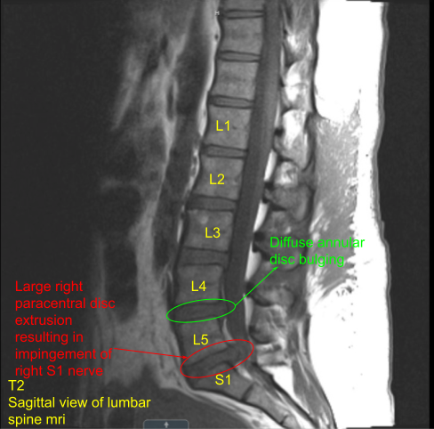 A patient presented with severe radicular pain on the right lower extremity, which was not relieved with conservative treatment and the patient was admitted to the hospital where a Magnetic resonance imaging (MRI) was done, which showed an extruded disc of L5-S1. The patient was also having weakness in the S1 myotome on the right.