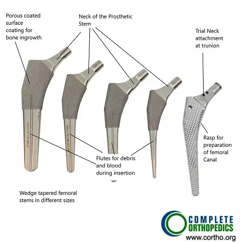 The upper part of the femoral stem may be coated with a special porous material to allow bone ingrowth for rigid fixation. The lower end of the femoral stem is usually tapered to fit snuggly in the femoral canal.