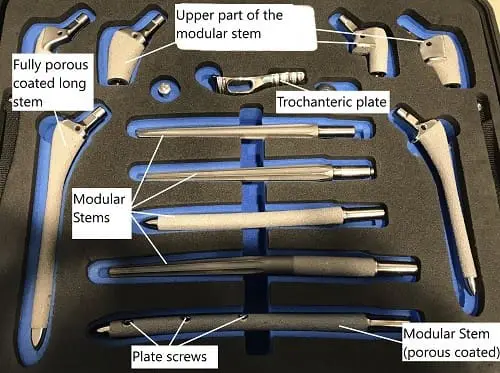 Displaced fractures may require the use of plates, wires, and screws. The implants may need to be revised along with fixation with other implants. The revised implants may have a longer stem or may be modified to accommodate the screws and plates.