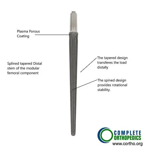 The image shows a splined tapered modular distal femoral prosthetic component. The tapered end allows ease of insertion and the splined design provides rotational stability in the femoral canal. The modular implants are commonly used in revision hip replacement surgery. The special design allows to achieve greater stability in the event of encountering bone loss during extraction.