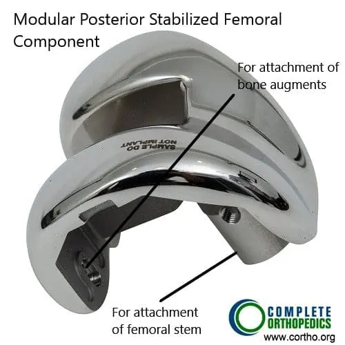 The modular components are used in revision knee replacement and complex knee replacement surgery. The components allow the surgeon to make intraoperative changes to achieve greater stability according to the patient’s anatomy and bone loss. The stem attaches to the upper part of the modular femoral component. While the femoral component is cemented to the lower part of the thigh bone, the stem is not cemented.
