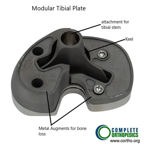 The above images show modular tibial component along with bone augments. The bone augments are used to fill in the bone gaps encountered during surgery. The stem helps to stabilize the tibial component in the shin bone.