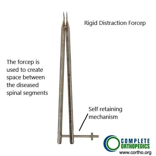 The rigid distraction forceps in the image above are used to create space between the diseased cervical vertebrae to remove the disc material and subsequent insertion of bone cage.
