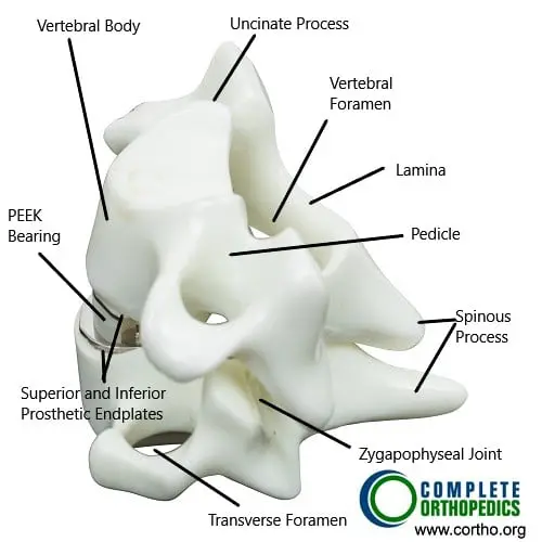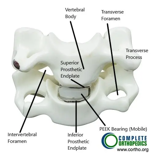 The images above show a total cervical disc replacement along with various parts of the cervical vertebrae. The PEEK (poly ether-ether ketone) polymer is used as a bearing surface. The prosthetic replaced disc re-duplicated the function of the normal cervical intervertebral disc.