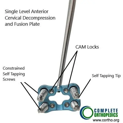 The image above shows a plate used to fuse the cervical vertebrae in anterior cervical decompression and fusion surgery. The surgery is performed from the front of the neck and a plate is fixed with the help of screws.
