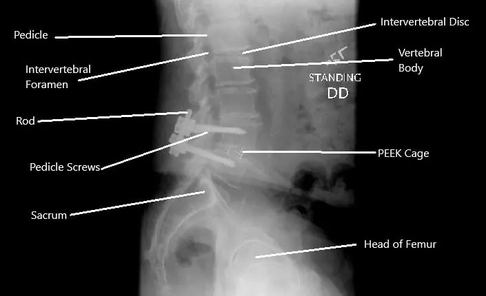 X-ray showing decompression and fusion of the L4-L5 vertebrae.