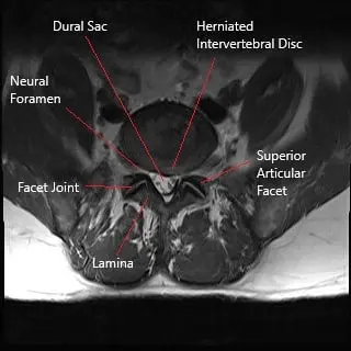 Axial section section of lumbar spine showing herniated intervertebral disc.