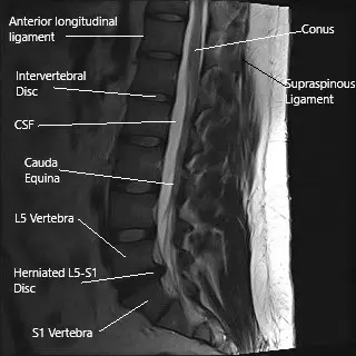 MRI of the lumbar spine in sagittal section showing herniated L5-S1 intervertebral disc.
